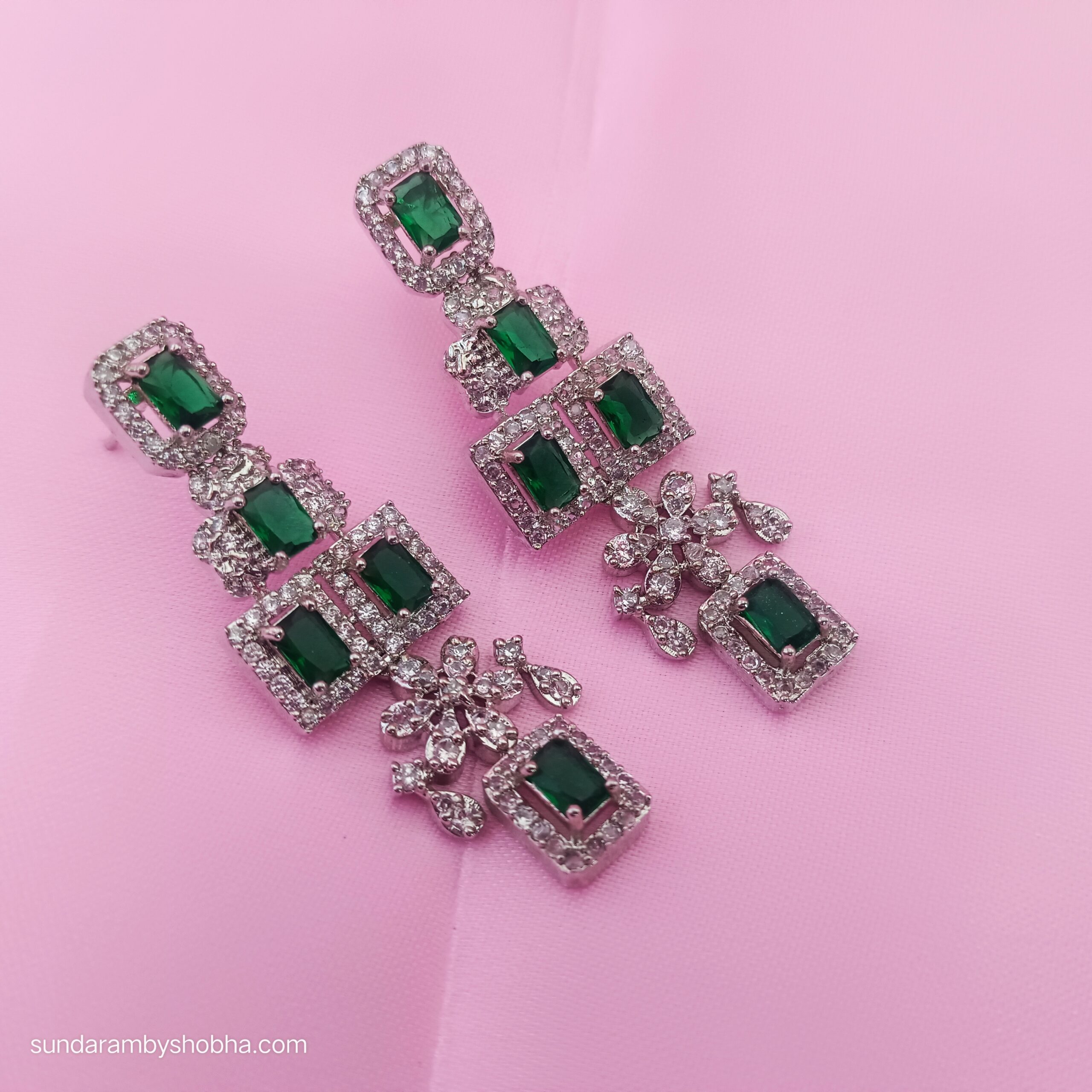 This is designer American Diamond necklace with most graceful look. Big Green Pendant stone and long earring with big green stones enhances the elegance