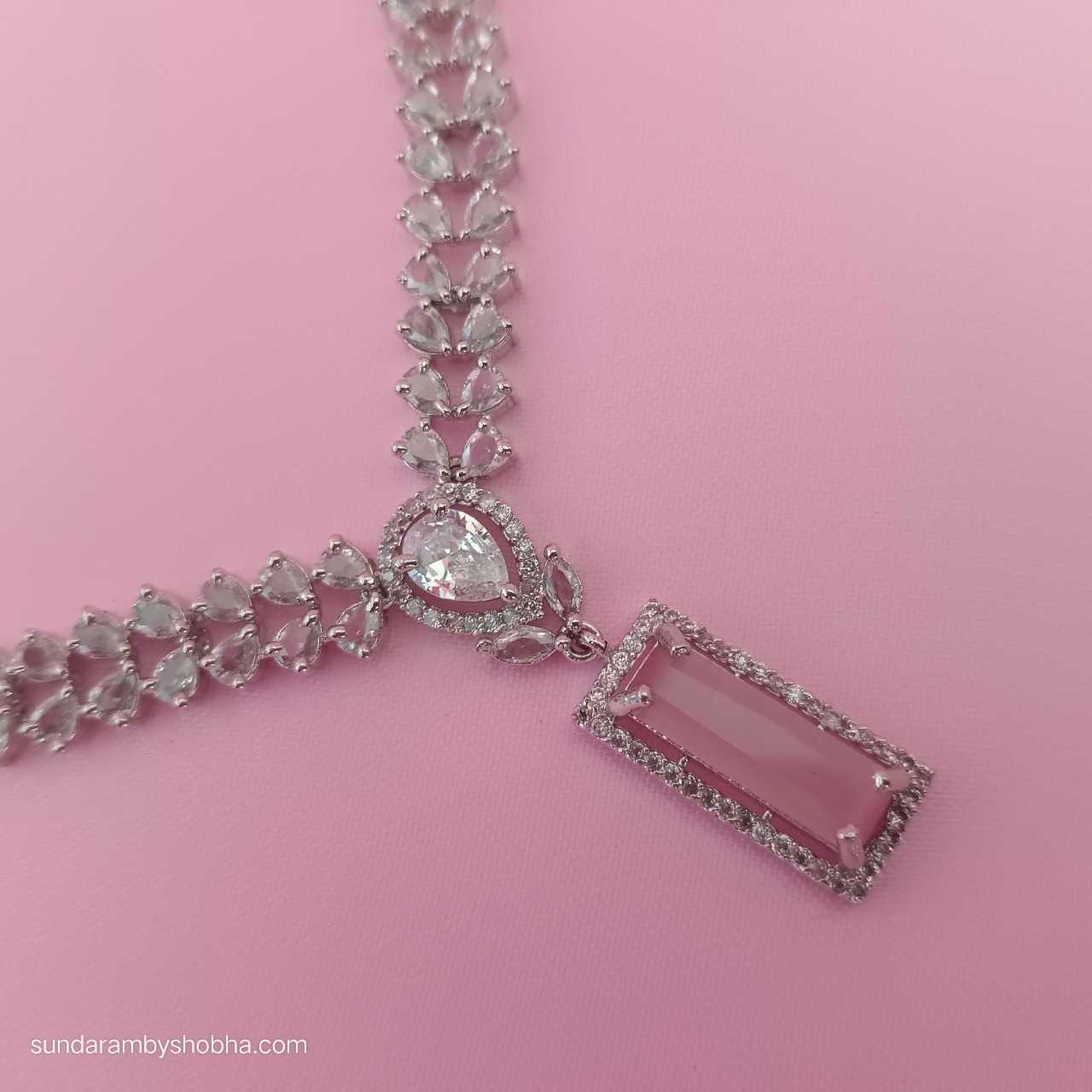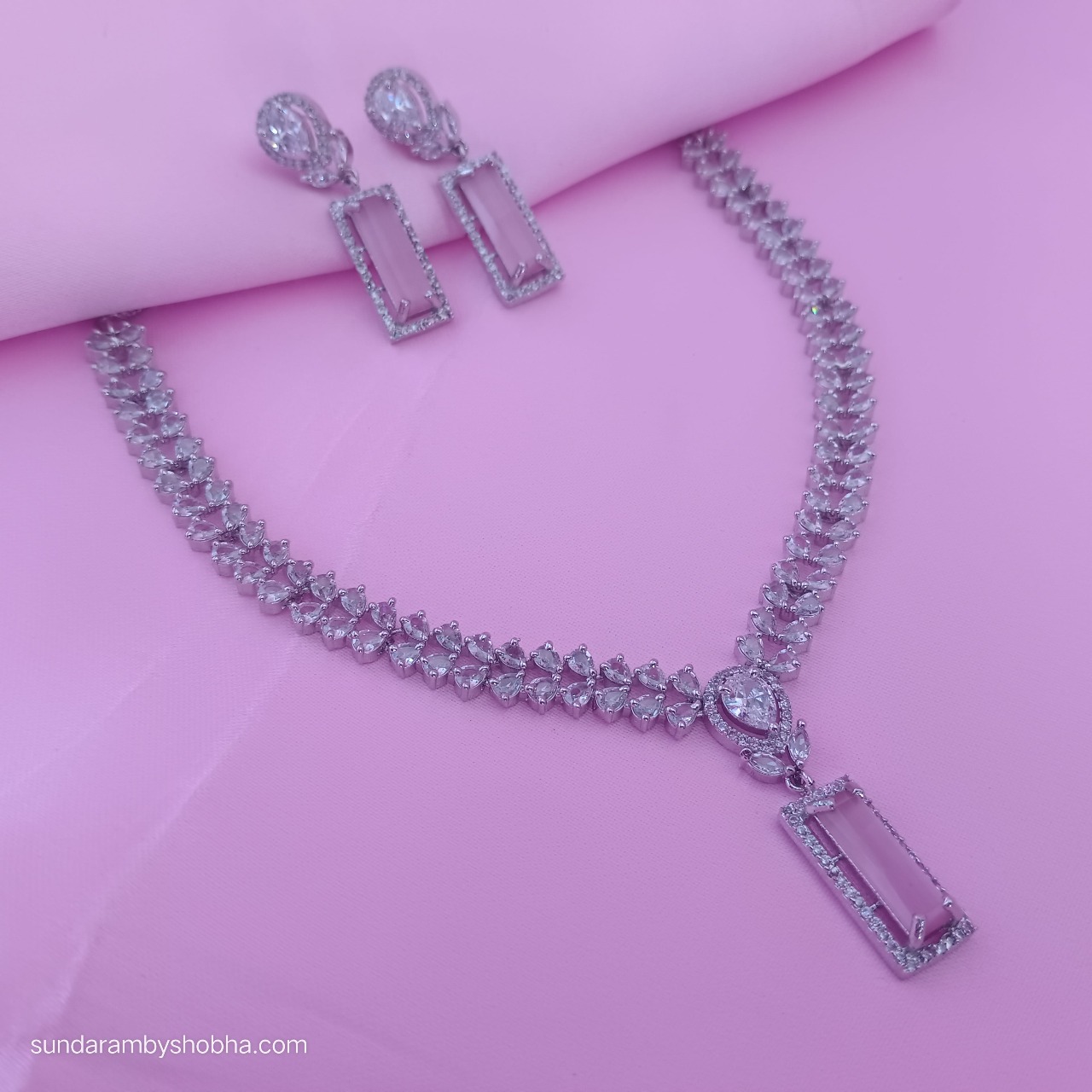 Be the first to review “Elegant American Diamond Necklace Set with Pink Pendant and Drop Earrings”