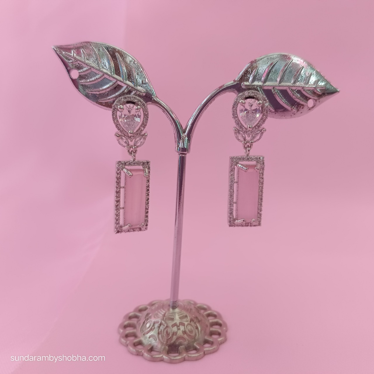 This is an Elegant Necklace with pink rectangle pendant and matching drop earrings.