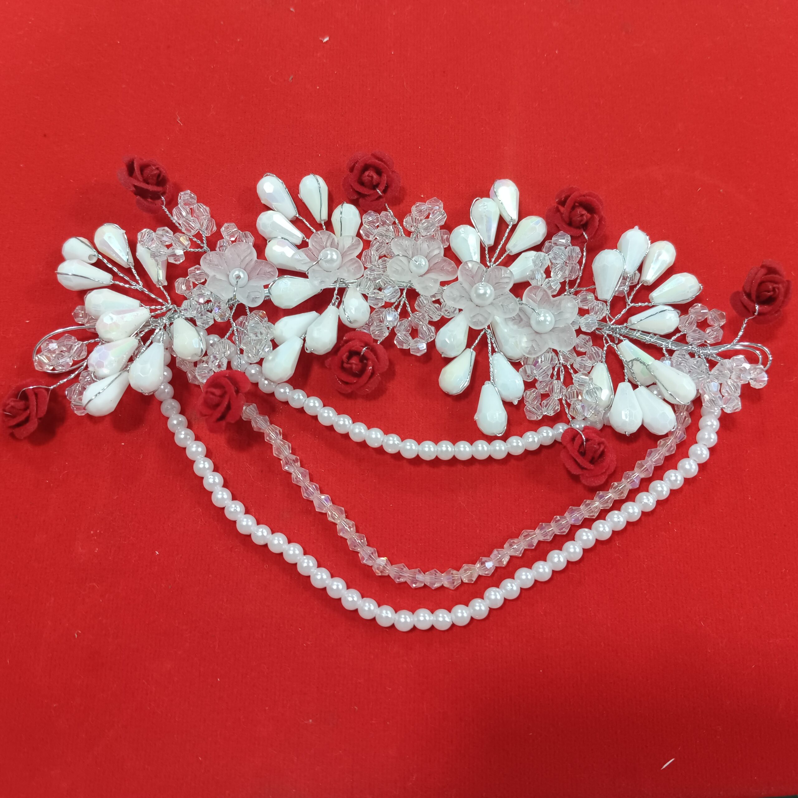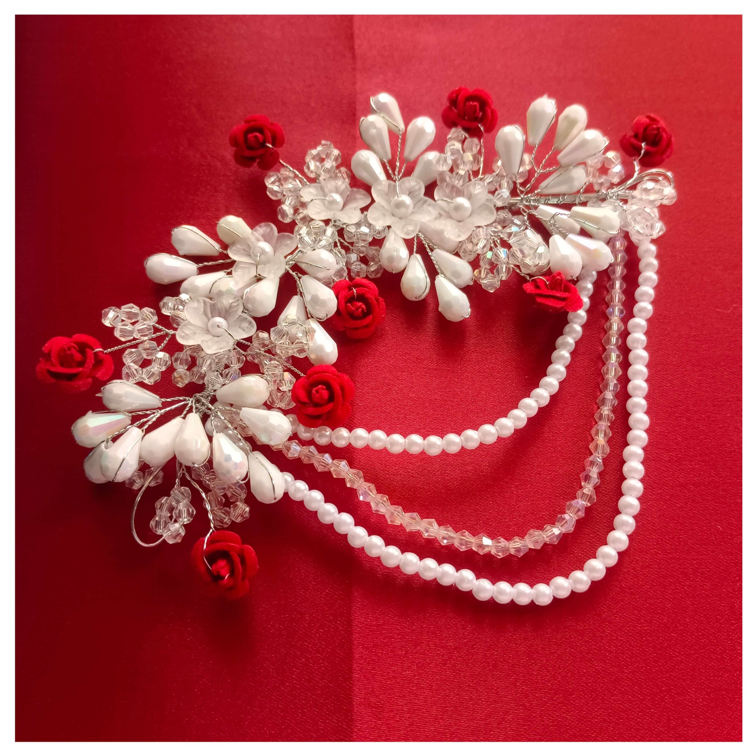 Hair Pin in made with floral beads in white with red flowers and pearl hangings.